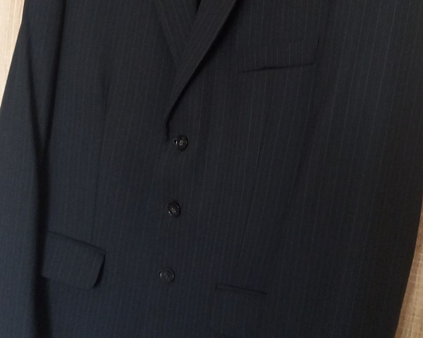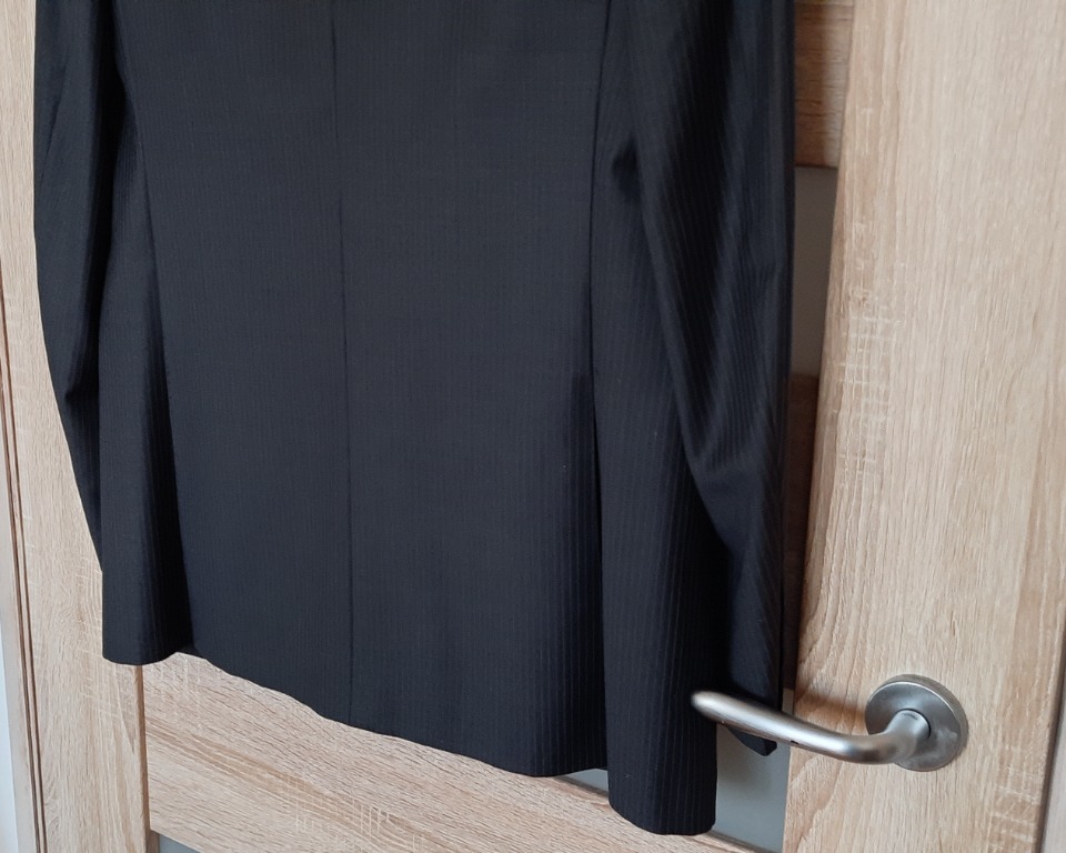 Cena 40 zł. Kolor grafitowy wpadający w czarny, wełniana, na 182 cm wzrostu (182 / 96 / 82). Marynarka: długość rękawa ok. 69 cm, zapinana na 3 guziki, w klapie butonierka, kieszonka na poszetkę, dwie kieszenie zewnętrzne z patkami, wewnątrz 4 kieszenie. Całość na doskonałej jakości podszewce. Zakupiona w salonie, uszyta bardzo starannie w każdym szczególe. Bardzo wygodna, całoroczna, pasuje do różnych stylizacji, zawsze prezentuje się bardzo pięknie. Zapraszam, tel. 507-694-505.