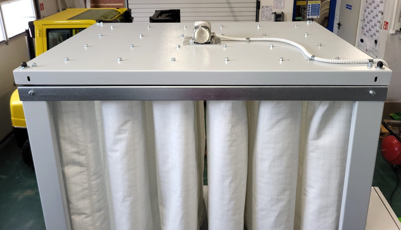 Filtr EK-24 o wydajności 4800m³/h z wentylatorem WTK-4 oraz mechanicznym otrzepywaniem worków filtracyjnych ze zrzutem do worków tekstylnych 2 x 220l