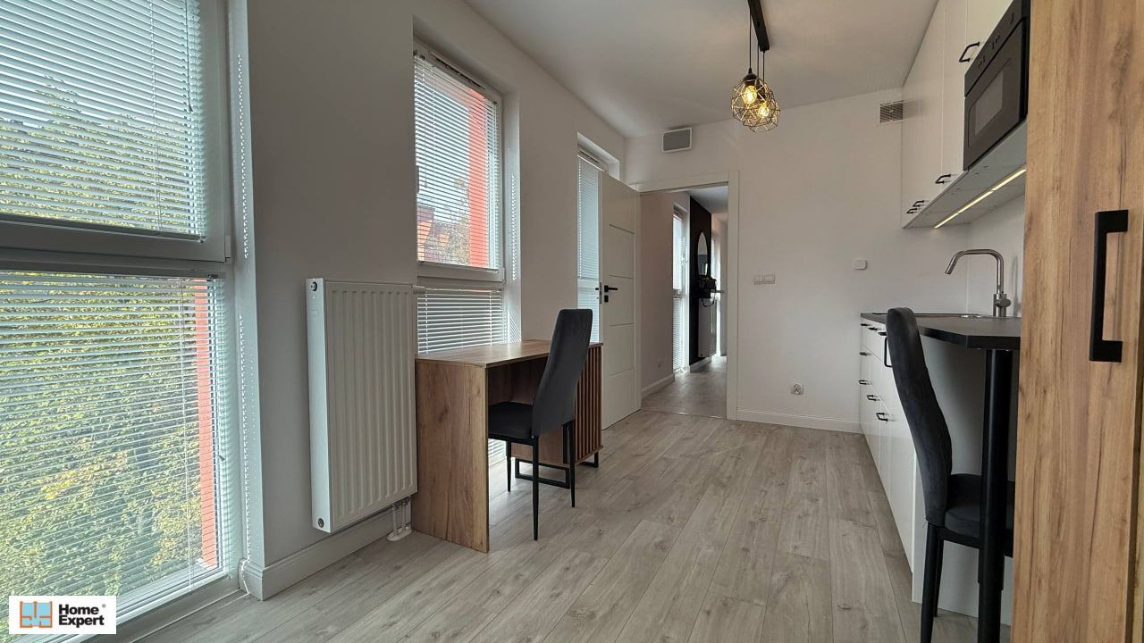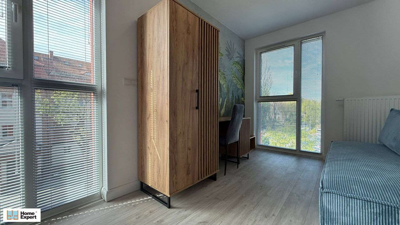 Układ mieszkania sprawia, że to idealna opcja dla studentów lub osób pracujących – dwa oddzielne pokoje pełnią funkcję dwóch małych mieszkań, każdy z własnym aneksem kuchennym.