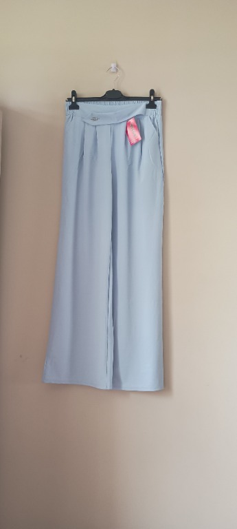 Spodnie damskie z szerokimi nogawkami firmy MIEGO. Rozmiar z metki s/m, wymiary na płasko pas 64-90 cm, biodra 100-120 cm, długość całkowita 105 cm. Kolor błękit. Cienki materiał.