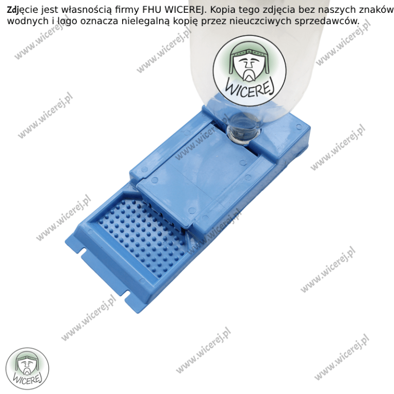 Użycie poidła jest bardzo proste – wystarczy napełnić odpowiednią butelkę wodą/syropem lub inną cieczą, wkręcić do poidła do góry dnem, a ciecz będzie dozowała się automatycznie na zasadzie podciśnienia. Poidło zapewnia higieniczne poddawanie wody / syropu pszczołom.
