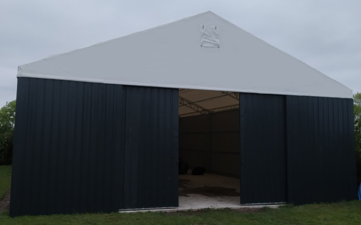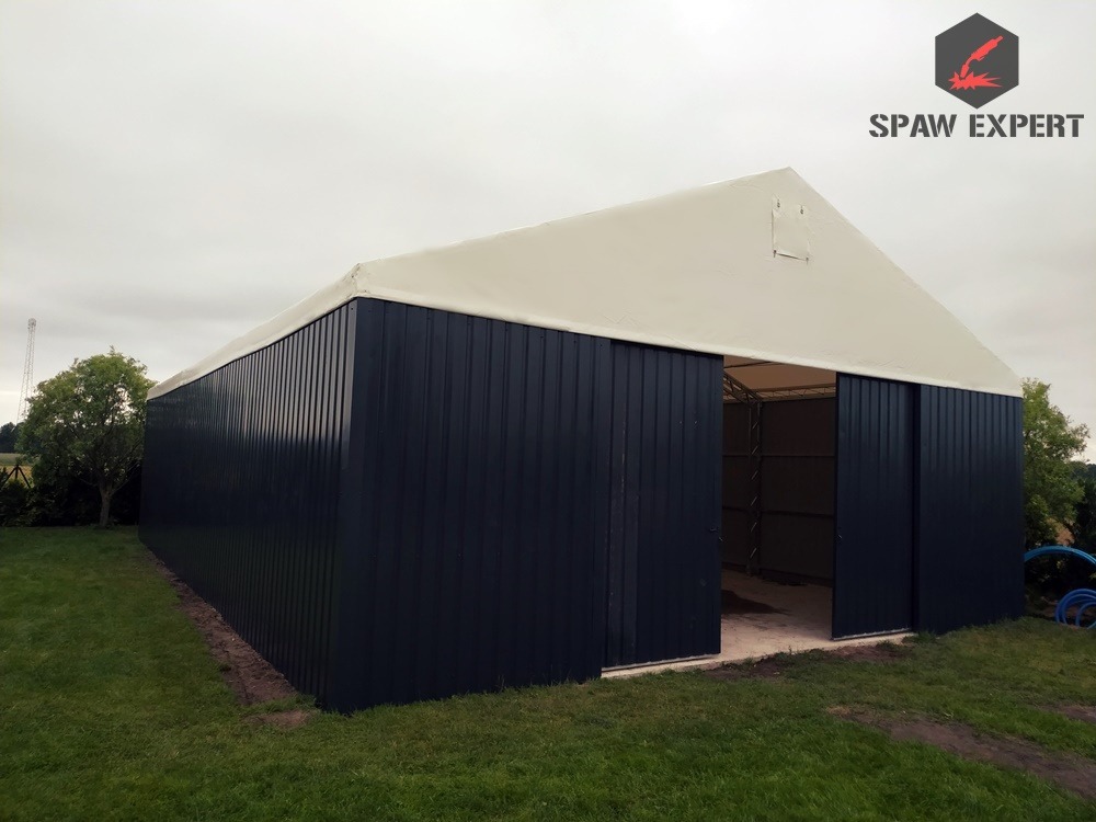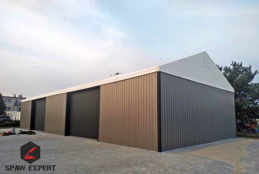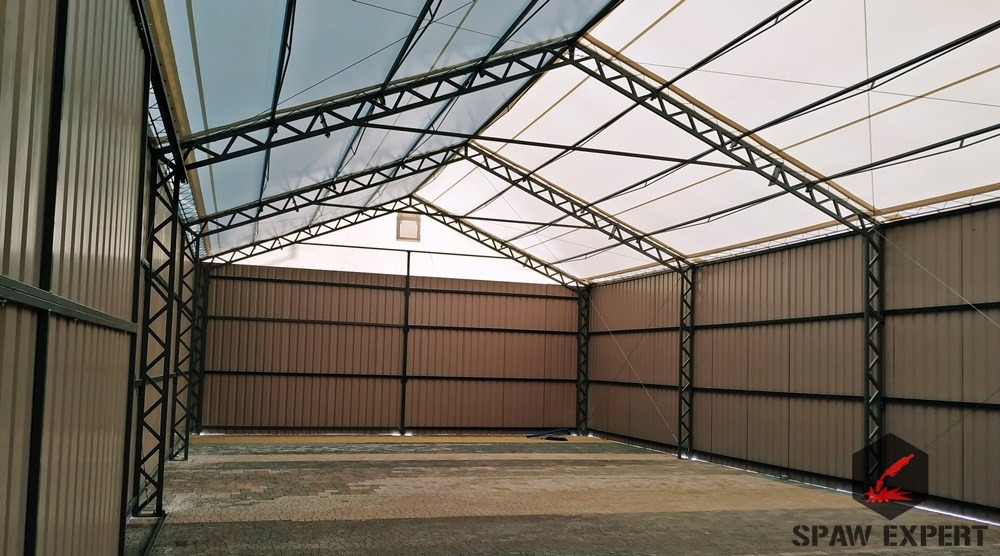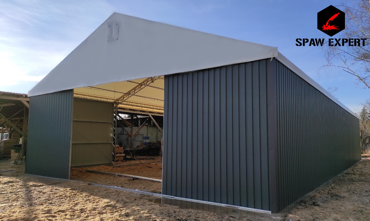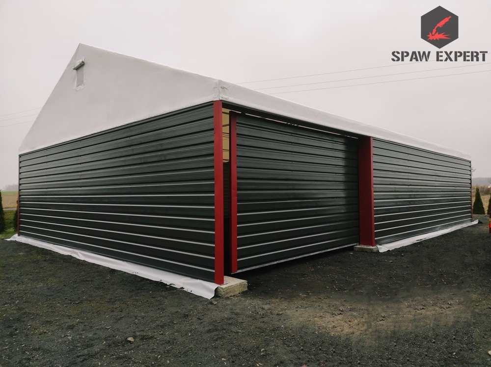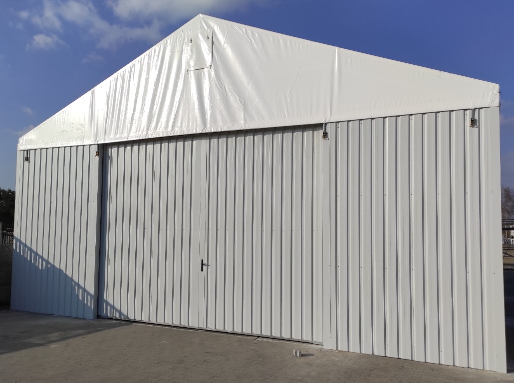 Konstrukcja stalowa jest zabezpieczona antykorozyjnie przez proces cynkowania ogniowego. Materiał dachowy to plandeka o gramaturze 680gr/m2, natomiast boki to blacha trapezowa T 18.