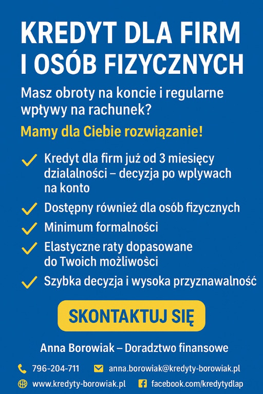 KREDYT DLA FIRM do 80 000 PLN Masz stratę w firmie albo brak zdolności? U nas to nie problem! - BARDZO DUŻA PRZYZNAWALNOŚĆ - Proces w 100% online - Wstępna decyzja już w kilka minut! - Akcept...