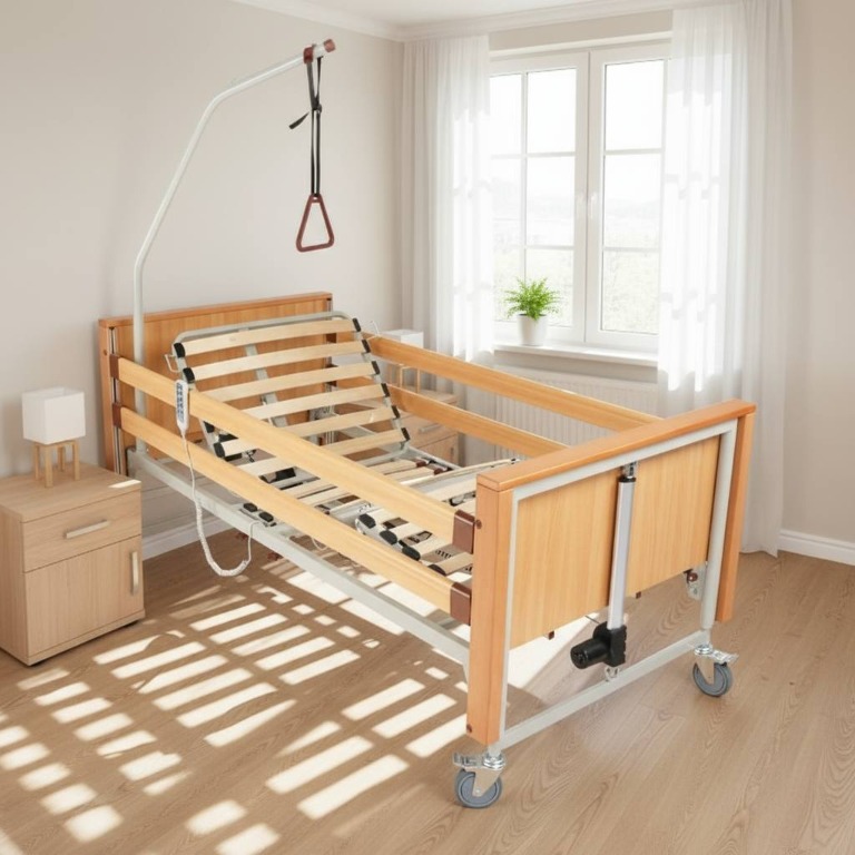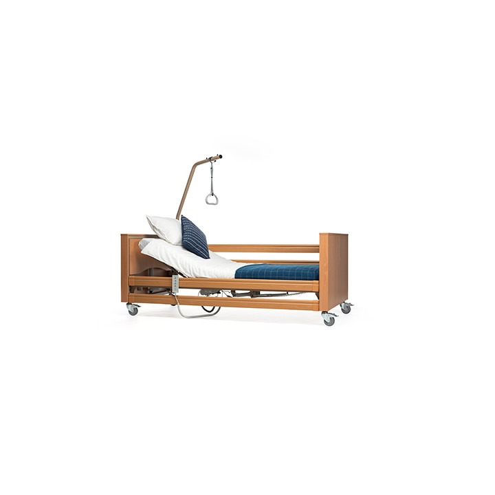 Mechanizmy łóżka oparte są na siłownikach renomowanej firmy LINAK, co zapewnia niezawodność i cichą pracę. Całość została wykończona obudową w kolorze buku, dzięki czemu sprzęt prezentuje się estetycznie i dobrze komponuje się z otoczeniem. W zestawie znajduje się wysięgnik z uchwytem oraz barierki ochronne – dostępne w wersji metalowej lub drewnianej. Także samo leże występuje w wariancie metalowym bądź drewnianym, co pozwala dopasować je do preferencji użytkownika. Dodatkowym ułatwieniem jest system transportowy, dzięki któremu łóżko można łatwo przemieścić i ustawić w docelowym miejscu.