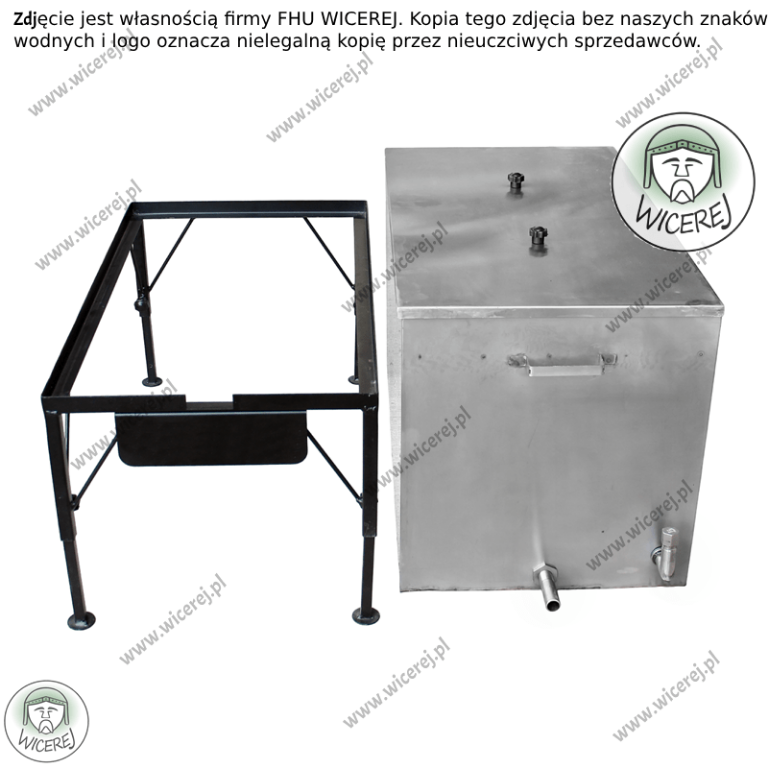 Topiarka parowa do wosku całoramkowa 20/28 ramek na ramki Dadant/Wielkopolskie/Ostrowskiej, wykonana ze stali nierdzewnej. Topiarka wykonana solidnie, jest mocna i wytrzymała. Zaletą tego modelu są regulowane nogi – dzięki czemu wygodnie można podstawić pojemnik na wosk. Regulowane nogi zapewniają też wygodne używanie taboretów gazowych, kuchenek elektrycznych itp., które należy podstawić pod topiarkę, aby podgrzać wodę.