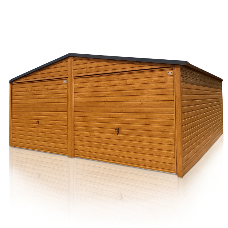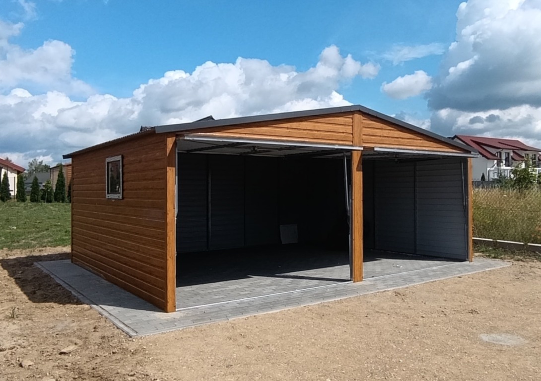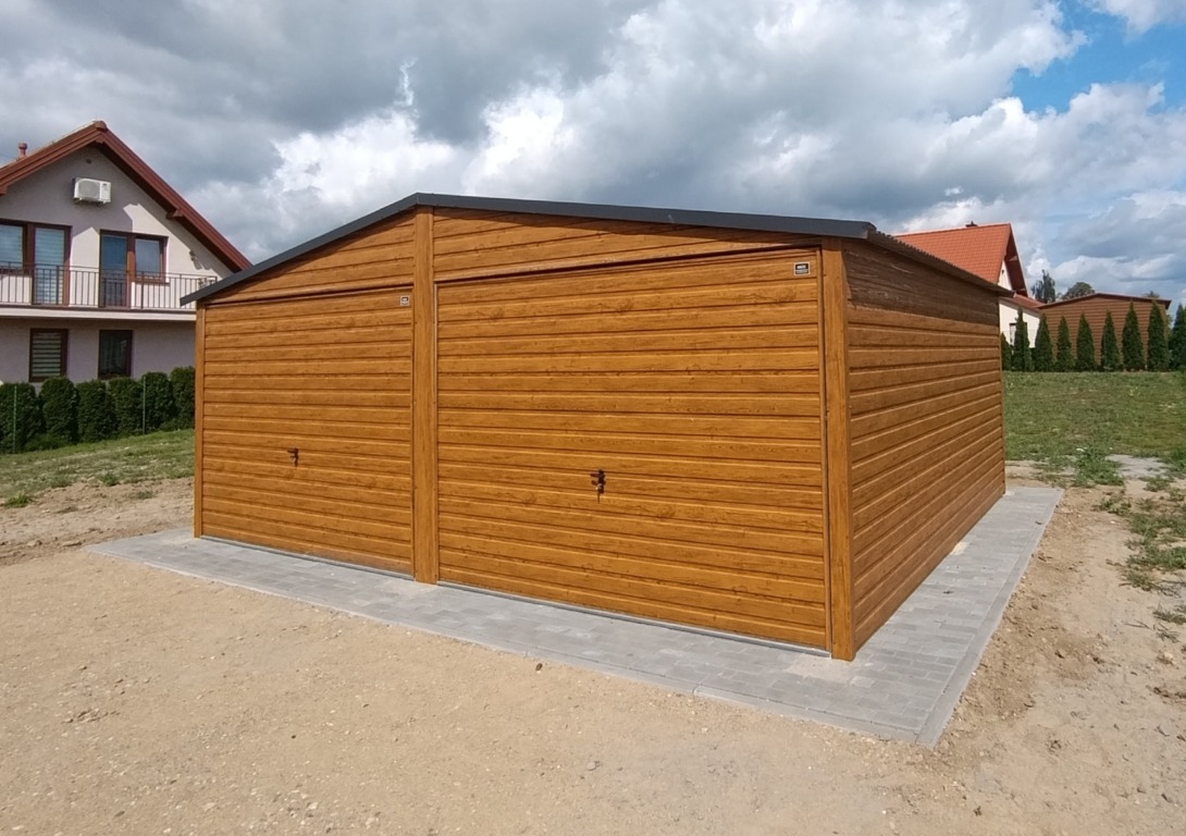 Garaż blaszany dwustanowiskowy 6×5 bramy uchylne, dwuspadowy, Drewno