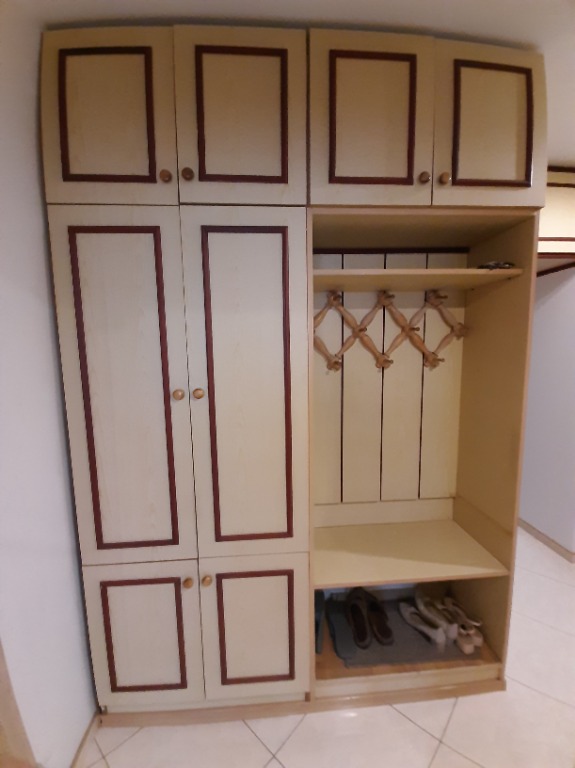 Praktyczne szafy do przedpokoju w jasnym kolorze z ciemnymi akcentami. Oferowany zestaw składa się z trzech pionów, w każdym jest oddzielny pawlacz, w których jest dużo miejsca na przechowywanie. Szafy są w w dobrym stanie, mogą stanowić funkcjonalne i estetyczne uzupełnienie aranżacji Twojego przedpokoju.