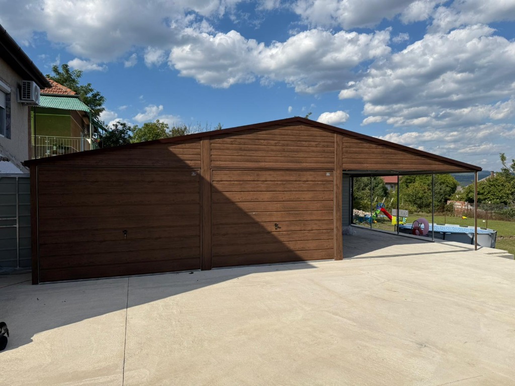 Garaż blaszany dwustanowiskowy 11×5 z wiatą bramy uchylne, dwuspadowy