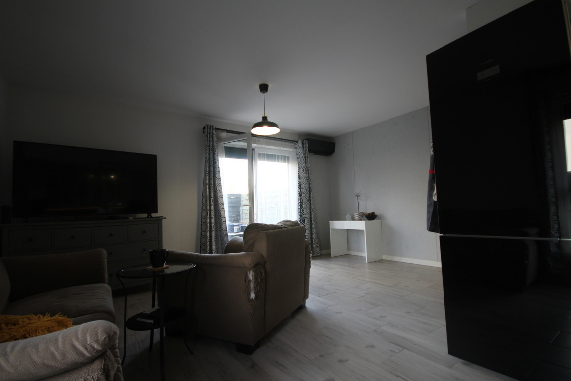 Wnętrze mieszkania wykończone jest z dbałością o szczegóły – na podłogach w pokojach położone są panele, natomiast w przedpokoju, salonie, kuchni oraz łazience znajdują się płytki. Salon zdobi beton architektoniczny, a dodatkowo zamontowana klimatyzacja zapewnia komfort przez cały rok. Z salonu prowadzi wyjście na prywatny ogród o powierzchni 207 m², który stwarza idealne warunki do relaksu i spędzania czasu na świeżym powietrzu. Dodatkowe ogrodzenie zapewnia intymność i komfort.