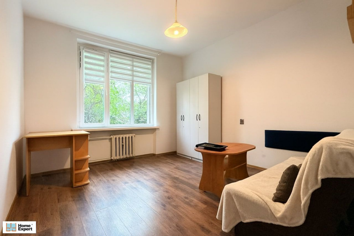 Mieszkanie jest na wysokim parterze, za oknem jest zielone podwórko.