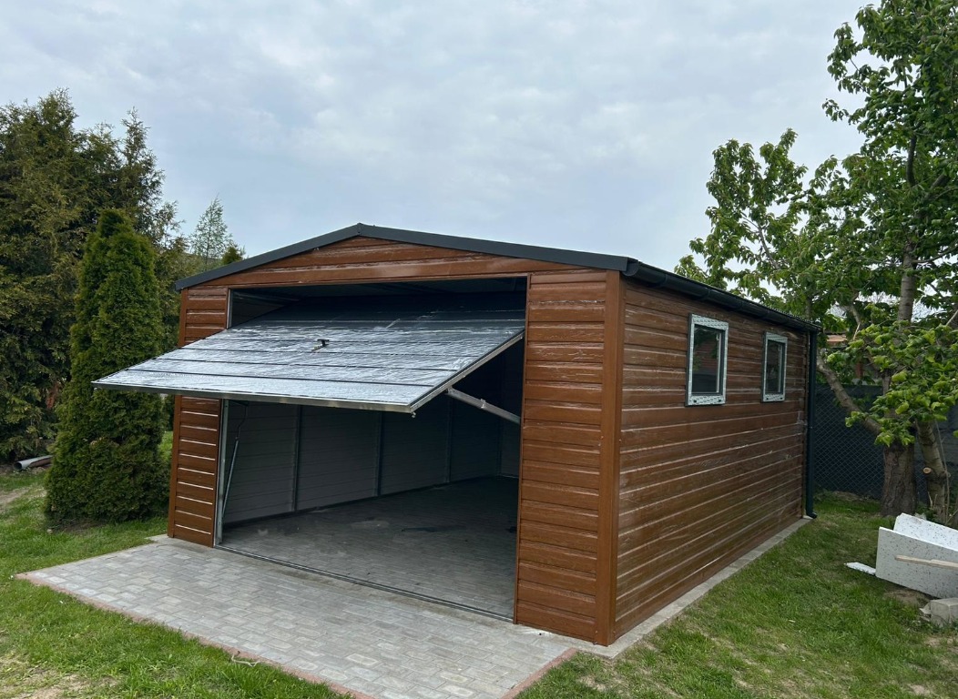Garaż blaszany 8×5 m drewnopodobny, dach dwuspadowy, bramy uchylne
