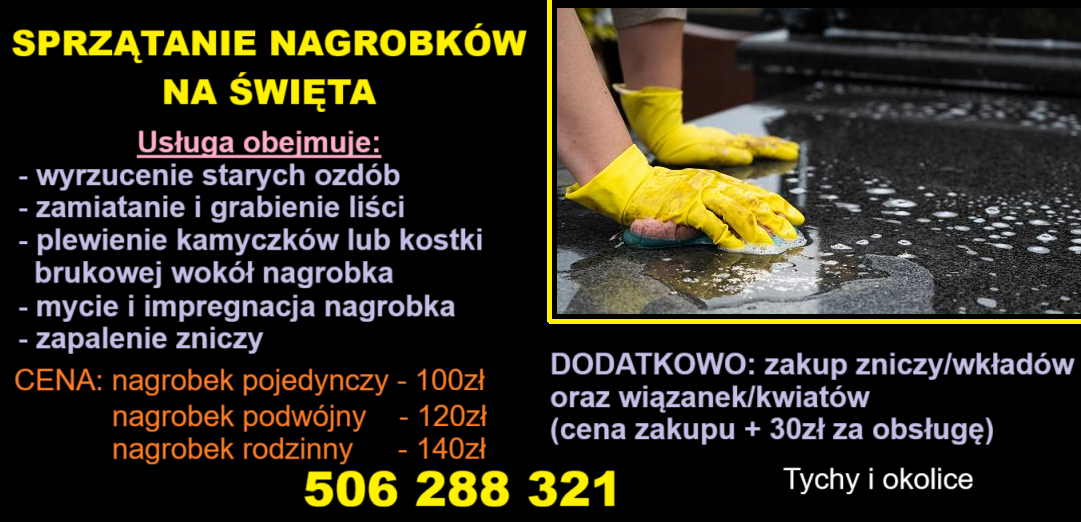 w związku z nadchodzącym Świętem zmarłych podejmę się sprzątania nagrobków na terenie Tychów i w okolicach. Jestem rzetelna i dokładna. Zapraszam do kontaktu telefonicznego.