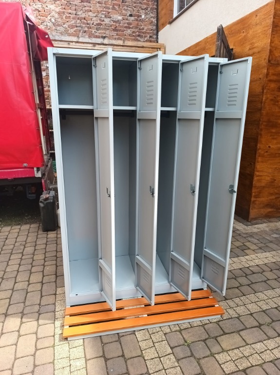Witam. Na sprzedaż posiadam nowe, nieużywane szafy ubraniowe BHP niemieckiej firmy Lullmann w kolorze Szarym. Każda szafa posiada 4 komory ubraniowe i siedzisko z drewnianymi listwami na nogach stalowych. Drzwi zamykane na kłódke.