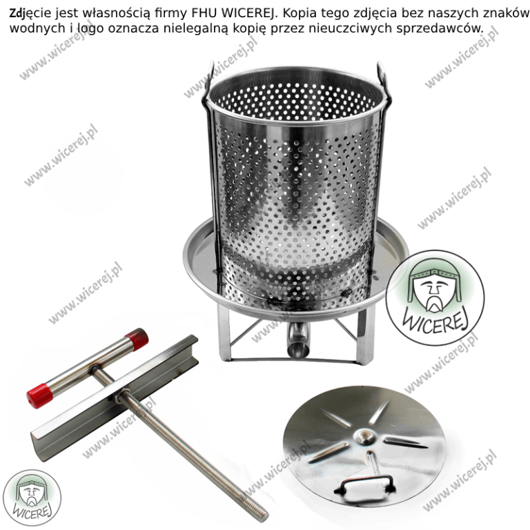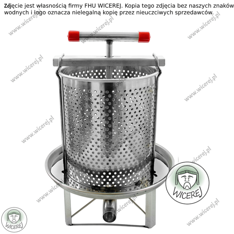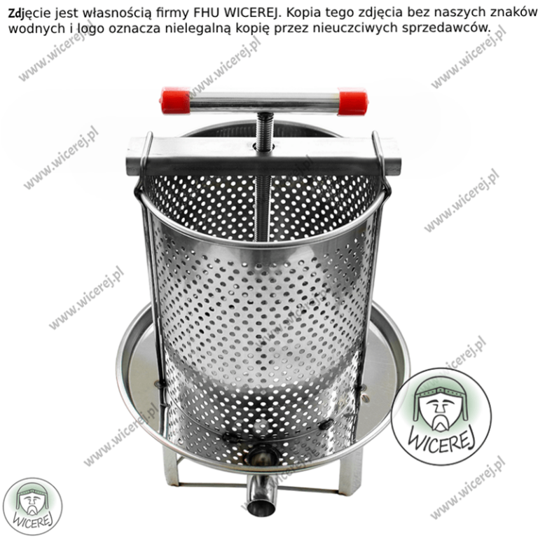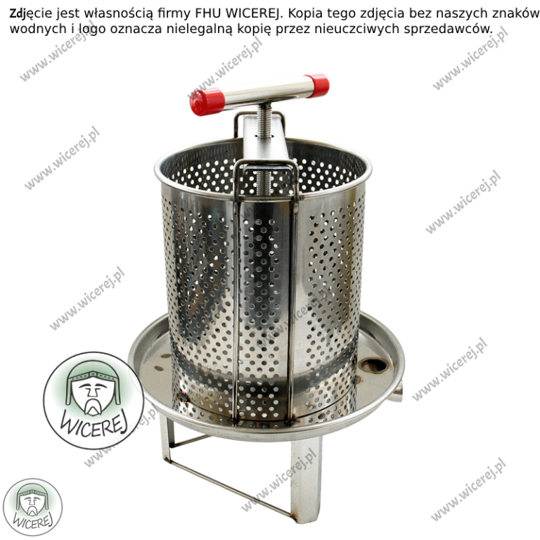 Posiadamy w ofercie wytrzymałą, ręczną prasę do wyciskania miodu z odsklepin. Prasa wykonana w całości ze stali nierdzewnej kwasoodpornej. Pojemność prasy około 10 litrów.