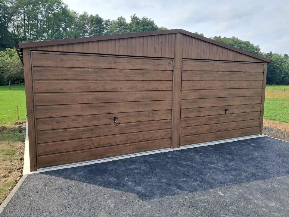 Garaż blaszany 7x6m - brama uchylna - okno - drzwi - blacha na rąbek - dach dwuspadowy ID1014