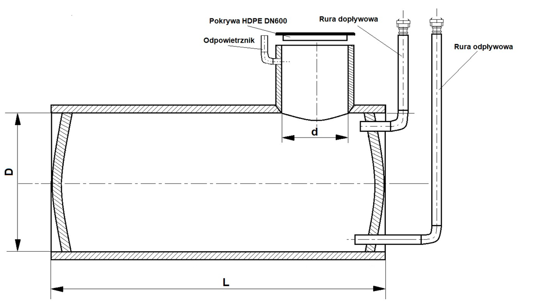wyposażony jest w dopływ oraz odpływ (zakończone złączem STORZ), jak również we właz wejściowo-inspekcyjny. Zbiornik można wyposażyć w sensory poziomu płynów, znajdujących się wewnątrz zbiornika. Zbiornik może mieć objętości kilkunastu do nawet kilkudziesięciu m3, przy czym zbiornik może być połączony z innymi zbiornikami, tworząc baterię zbiorników. Cena w ofercie dotyczy zbiornika o pojemności 8 m3, SN2, DN1400.