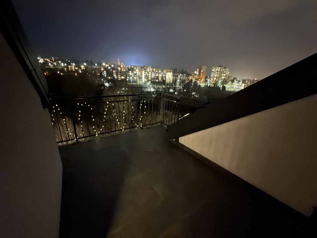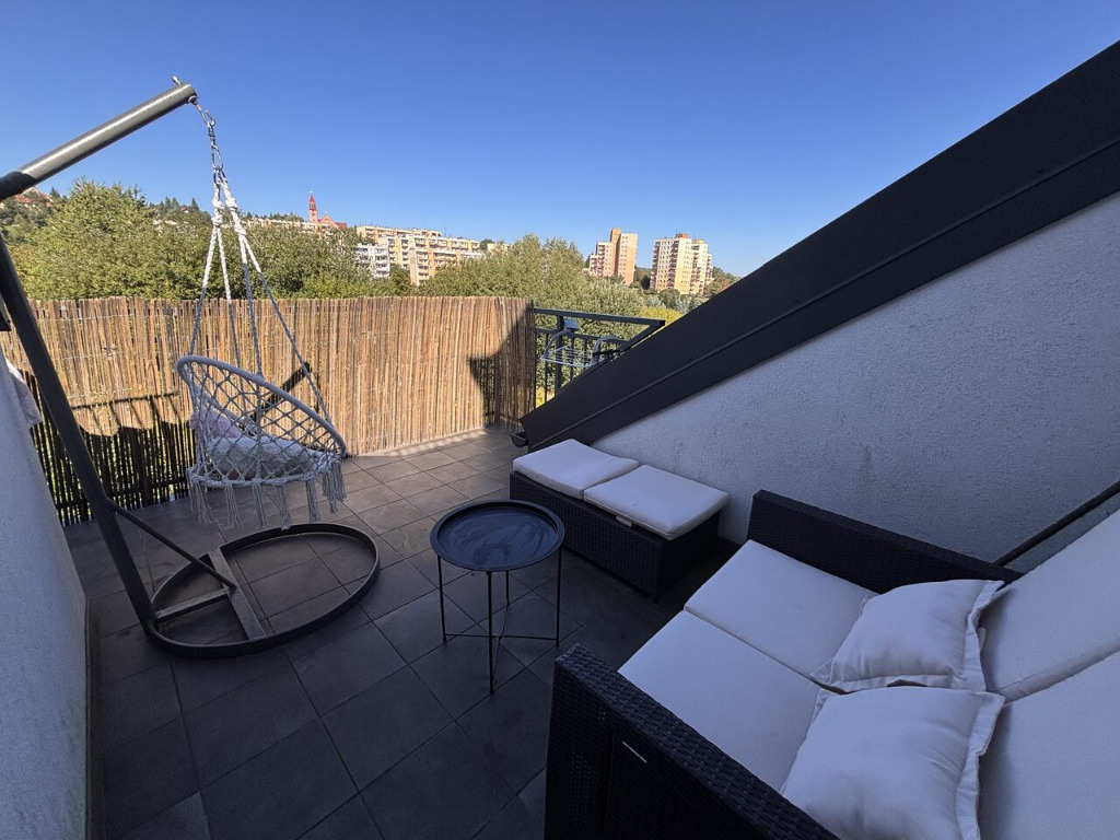 Taras bardzo duży spokojny taras z widokiem na zieleń i panoramę miasta.