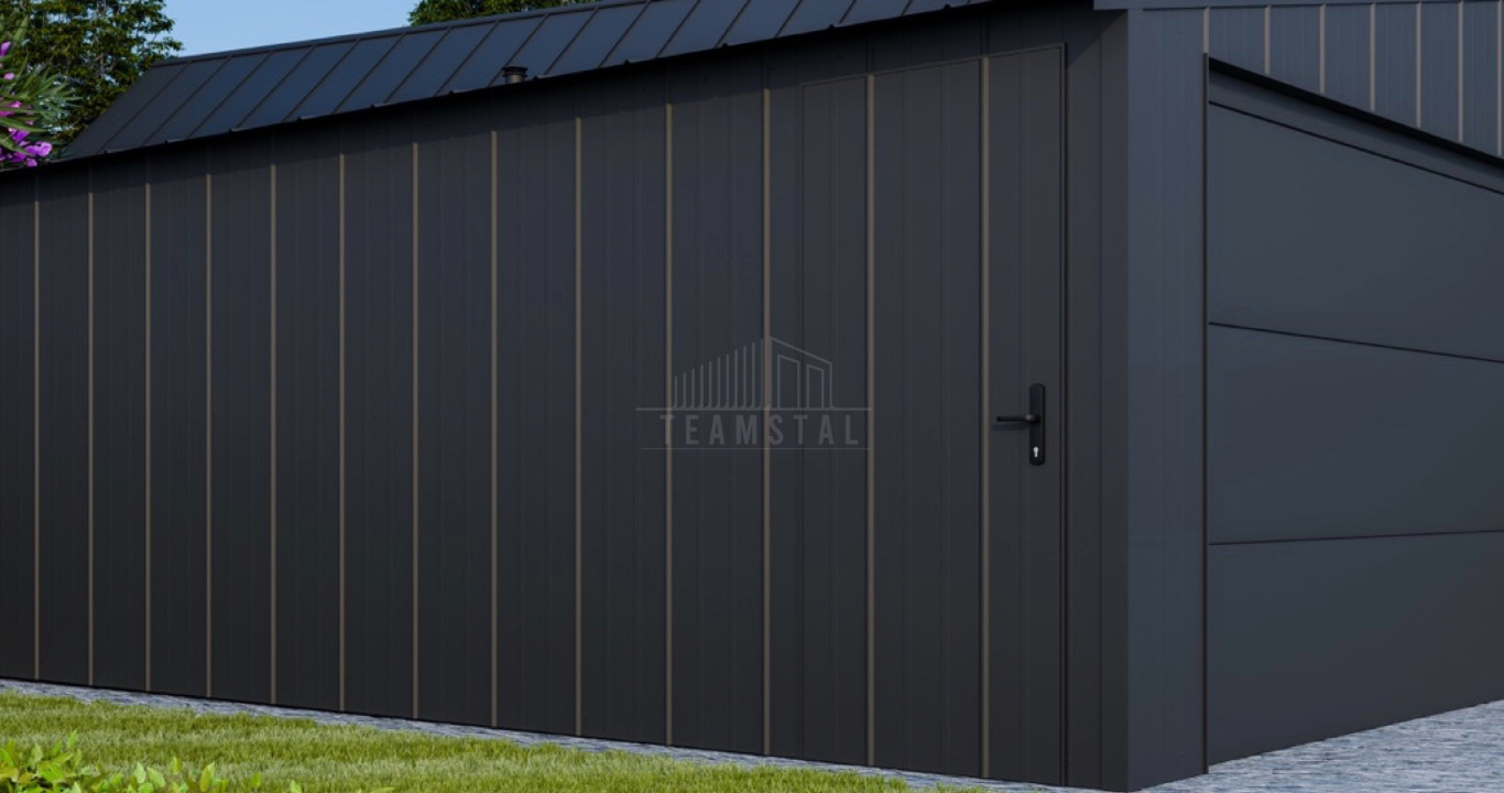 Garaż blaszany 5x6 - brama segmentowa - drzwi - blacha na rąbek - dach dwuspadowy TS1087