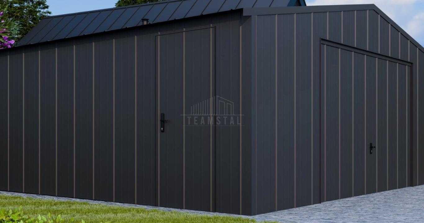 Garaż blaszany 6x5m - brama segmentowa - drzwi - blacha na rąbek - dach dwuspadowy ID1009