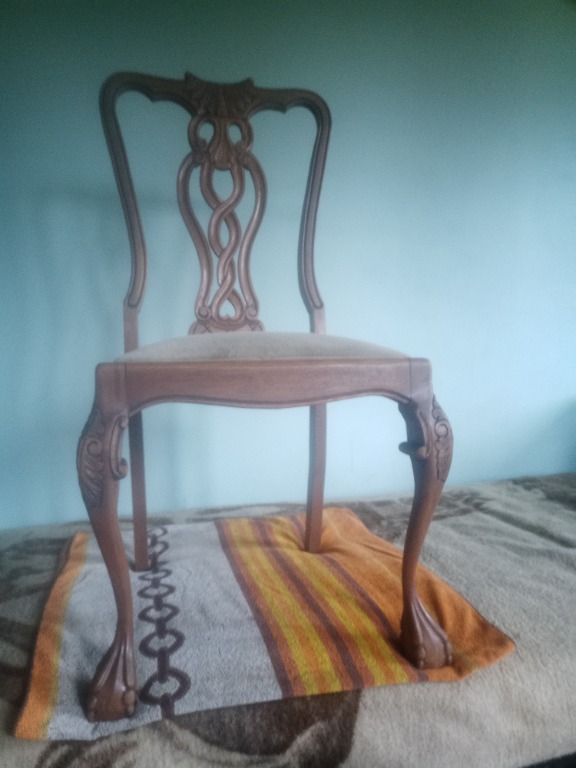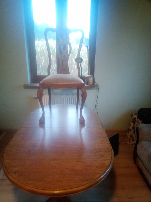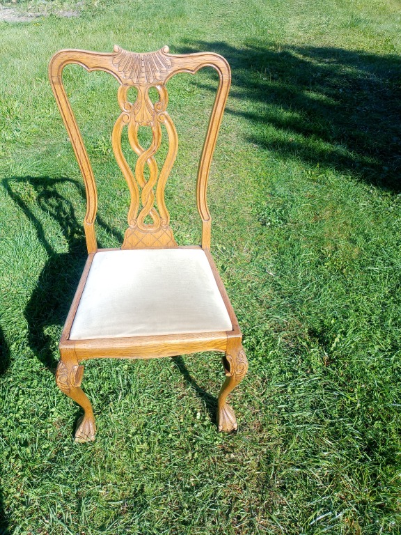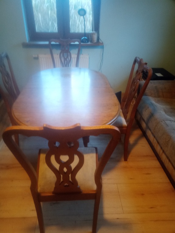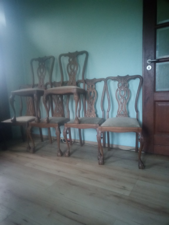 Luksusowe krzesła, dębowe, rzeźbione po renowacji. Wzmocnione. Zabezpieczone. Trzy krotnie lakierem. Fotki robione byle czym. Przepraszam. Zostało mi lakieru, więc oddam. W przypadku nowych zadrapań, wystarczy zwilżyć szmatkę w lakierze i cieniutko nałożyć lakier. Żadnych pędzli ! Mam też mały stoliczek że szklanym blatem, o średnicy, 80 cm. Grube szkło 5 mm. Za 3 stówki. Zapraszam w dowolnym dniu. /503835140/.