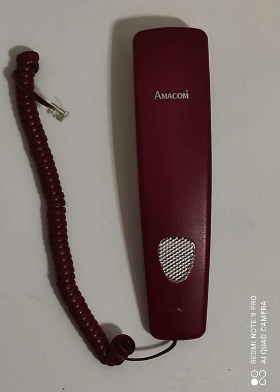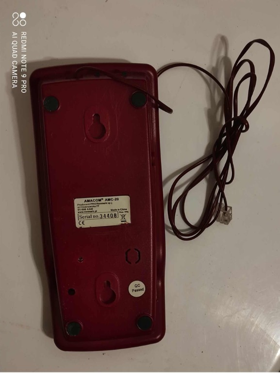 "Stacjonarny przewodowy telefon AMACOM AMC-20" w kolorze bordowych. Stan nowy, nieużywany, sprawny, słuchawka jak i telefon są przechowywane w folii bombelkowej, zawarta jest również instrukcja obsługi jak i deklaracja zgodności opisana poniżej.