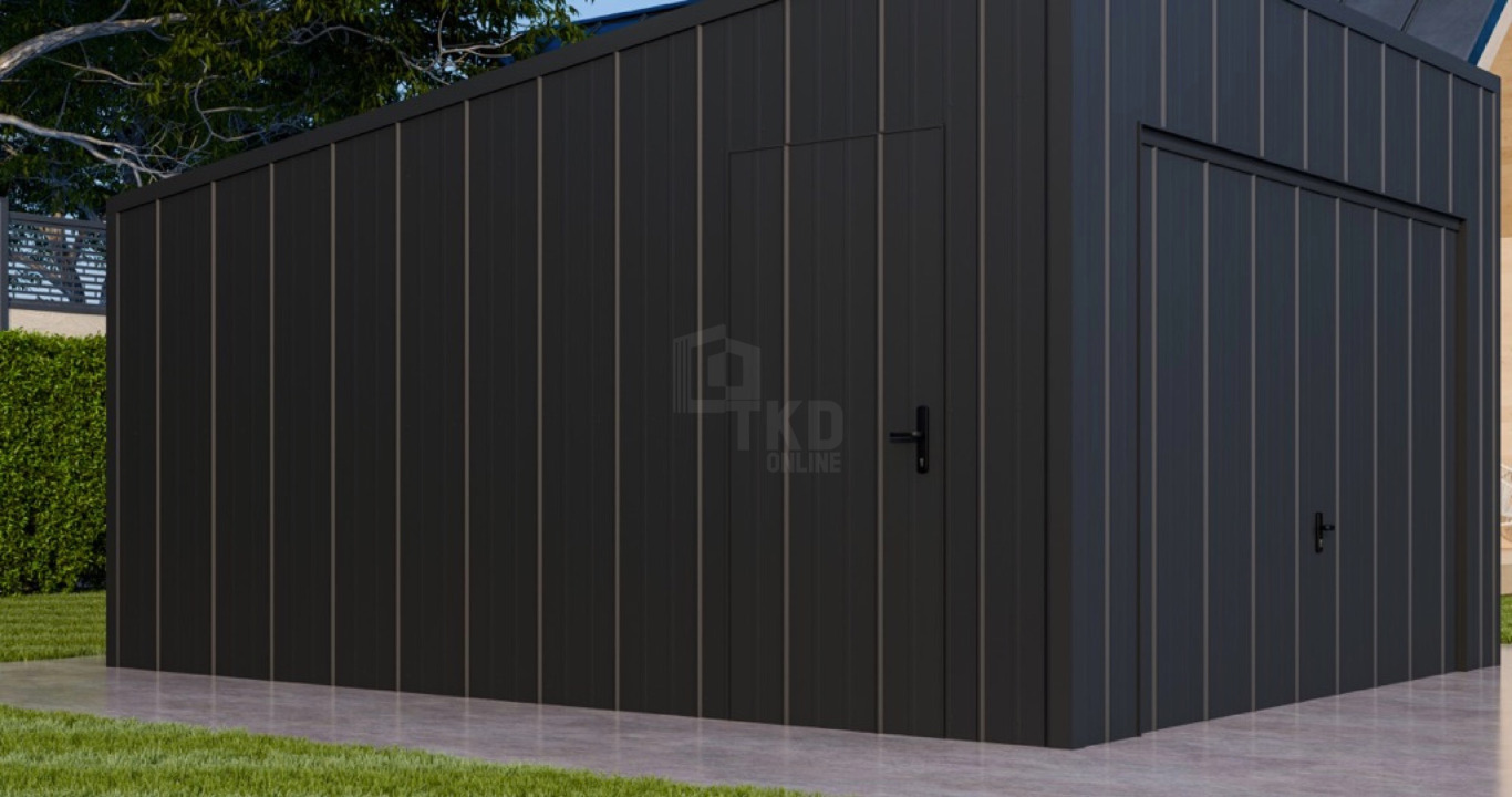 Garaż blaszany 5x4 - brama segmentowa - drzwi - blacha na rąbek - dach dwuspadowy TKD376