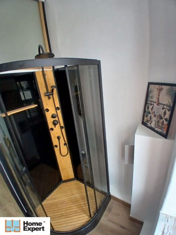 Łazienka połączona z kuchnią: kabina prysznicowa z hydromasażem, pralka, lodówka, kawiarka, kuchenka gazowa