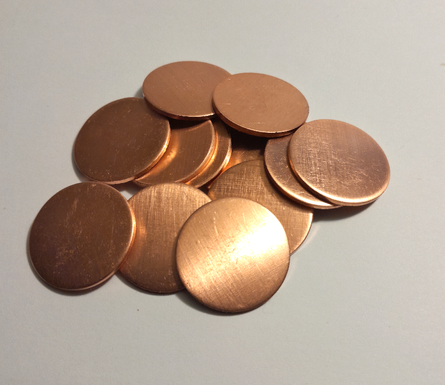 Krążki miedziane - mennicze dla wybijania monet lub ozdób .Średnice od 15 mm -27 mm
