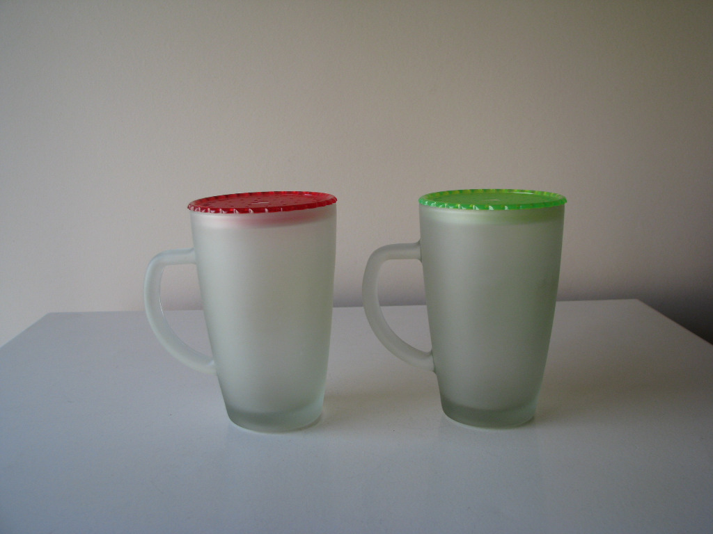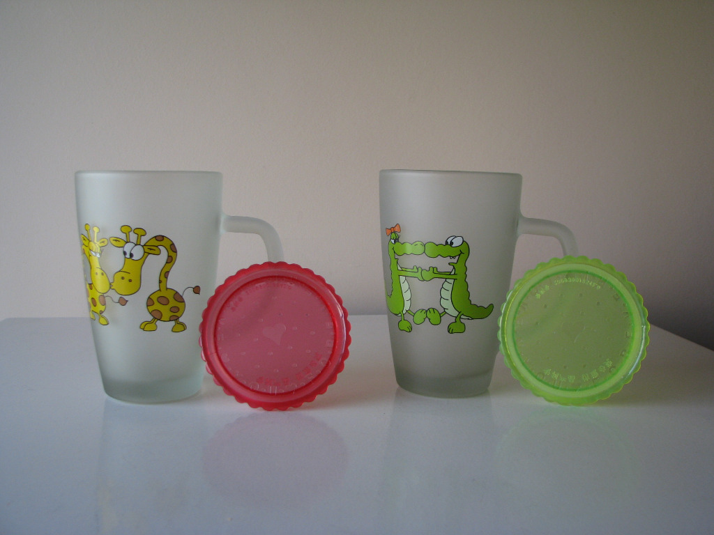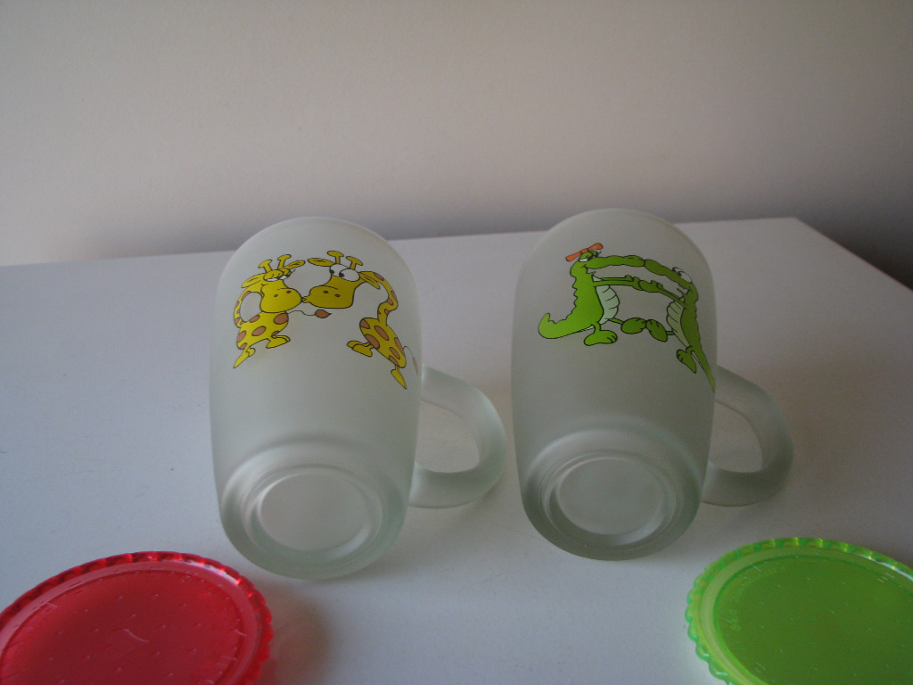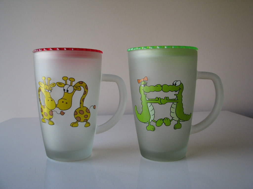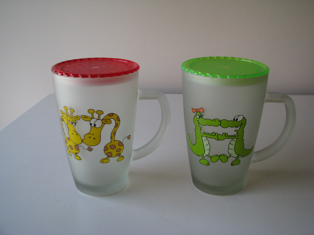 Sprzedam dwie urocze szklanki - kubki ze zmatowionego / szronionego szkła z pokrywkami z nadrukiem zakochanych zwierzaków.