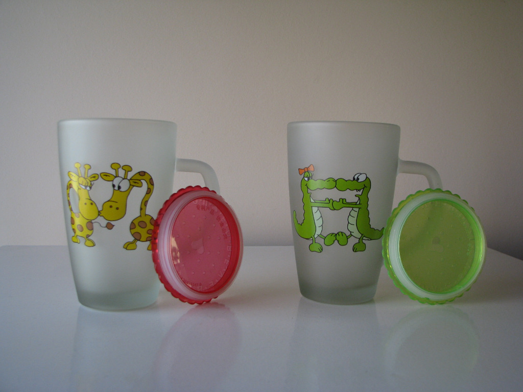 Kubki są solidne, o stożkowatym, zwężanym ku dołowi, kształcie i wyposażone w poręczne uszko do ich podnoszenia oraz szczelną pokrywkę zapobiegającą utracie ciepła lub zachowaniu zimna. Dodatkowego uroku dodaje im ozdobny nadruk zakochanych żyraf i wirujących krokodylków.