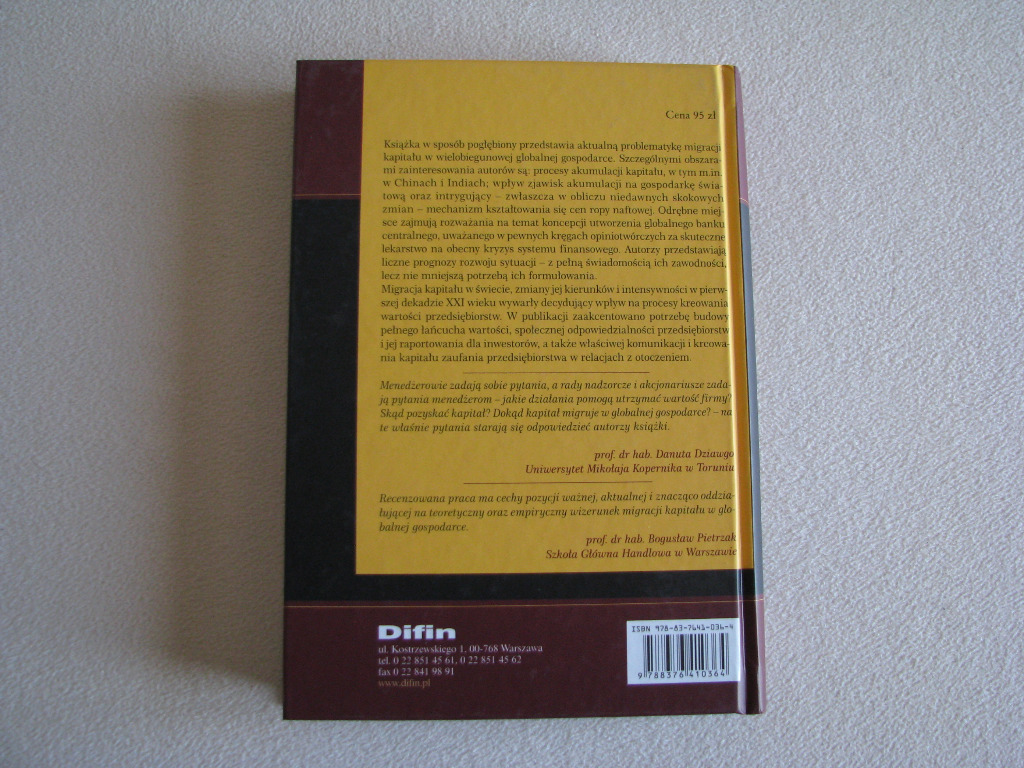 Publikacja poświęcona jest złożonym zagadnieniom migracji kapitału w kontekście globalnej gospodarki. Analizowane są tu procesy akumulacji kapitału w tym m.in. w Chinach i Indiach, mechanizm kształtowania się cen ropy naftowej, wpływ tych zjawisk na ekonomię światową i związane z tym pytania: Jakie działania pomogą utrzymać wartość firmy w dobie kryzysu? Skąd pozyskać kapitał? Dokąd kapitał migruje w globalnej gospodarce?