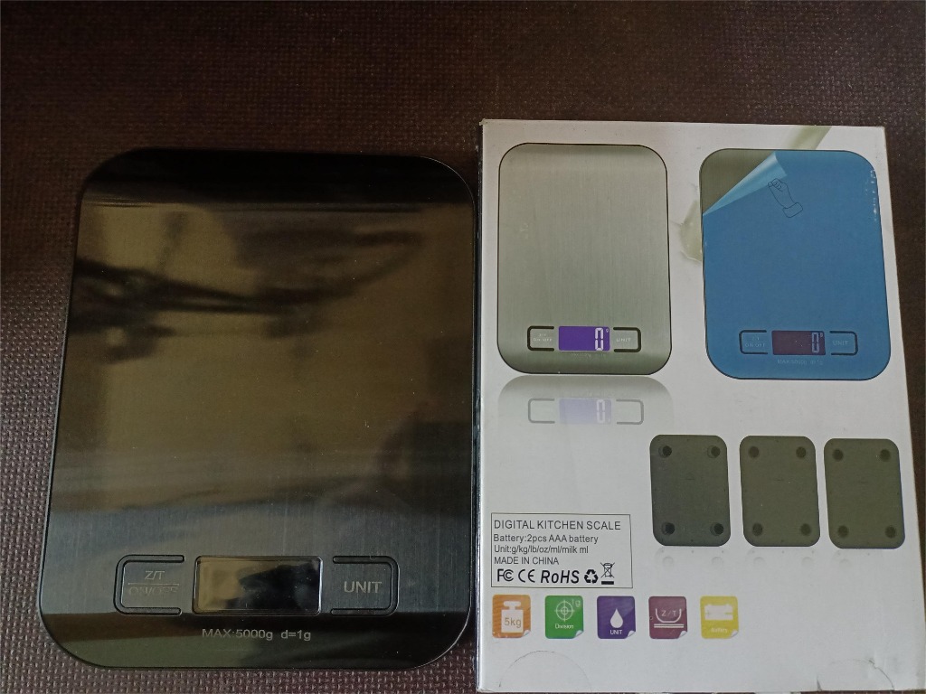 Płaska elektroniczna waga o zakresie do 5000 g (5 kg) i dokładności 1 g. Waga posiada wyświetlacz LCD z przyciskami:
