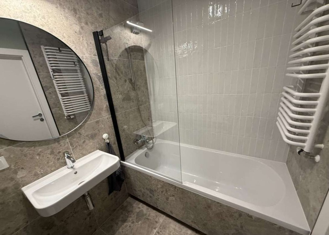 Nowoczesne wykończenie (jasne drewno, gres, designerskie oświetlenie).