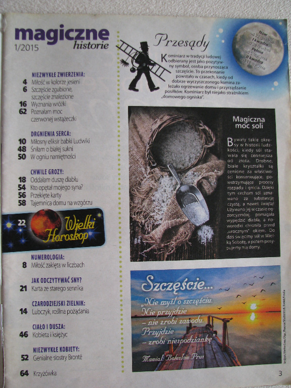 Znaleźć w nim można prawdziwe historie tematycznie nawiązujące do charakteru pisma, artykuły o numerologii, odczytywaniu snów, czarodziejskich ziołach, historię sióstr Bronte – autorek m.in. Wichrowych wzgórz oraz horoskop wraz z krótką charakterystyką sławnych postaci reprezentujących dany znak zodiaku tj:. Tamara Arciuch, Charlie Chaplin, Penelope Cruz, Pierce Brosnan, Marilyn Monroe, Johnny Depp, Meryl Streep, Tom Cruise, Madonna, Antonio Banderas, Salma Hayek, Piotr Rubik, Danuta Stenka, Roger Moore, Kayah, Leonardo DiCaprio, Tina Turner, Adam Małysz, Joanna Brodzik, Jim Carrey, Jennifer Aniston, K.K. Baczyński, Dorota Gawryluk i Bruce Willis.