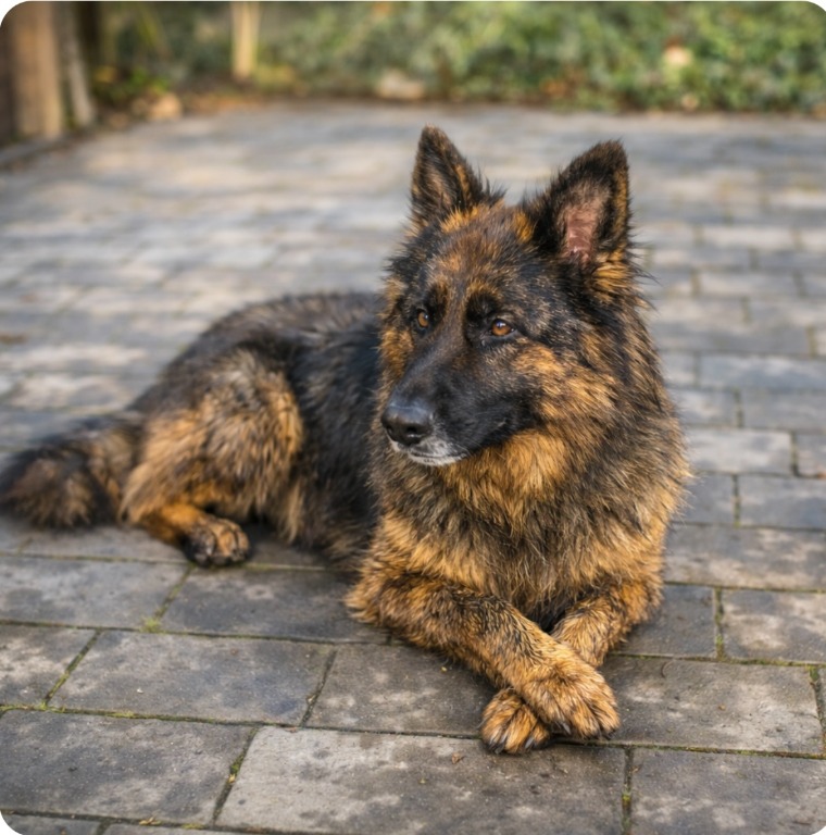 Pies jest typowym owczarkiem niemieckim – inteligentny, wierny i oddany opiekunowi.