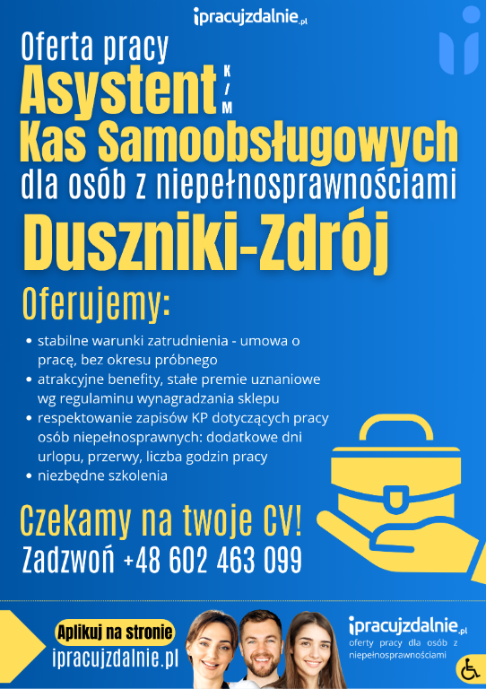 Szukamy kandydatów i kandydatki do obsługi kas samoobsługowych w dużym sklepie w Dusznikach-Zdroju. Ogłoszenie jest skierowane do osób z orzeczeniem o niepełnosprawności. Asystent przede wszystkim pomaga klientom, którzy zdecydowali się użyć kasy samoobsługowej. Stanowisko jest samodzielne, warunki pracy bardzo dobre. Bez okresu próbnego.