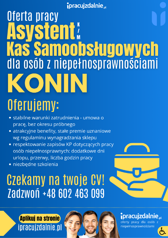Szukamy kandydatów i kandydatki do obsługi kas samoobsługowych w dużym sklepie w Koninie. Ogłoszenie jest skierowane do osób z orzeczeniem o niepełnosprawności. Asystent przede wszystkim pomaga klientom, którzy zdecydowali się użyć kasy samoobsługowej. Stanowisko jest samodzielne, warunki pracy bardzo dobre. Bez okresu próbnego.