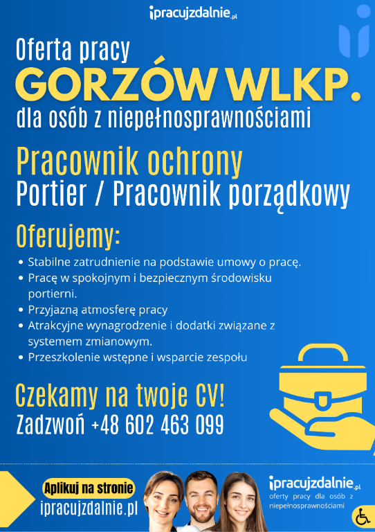 Dla naszego klienta, w ramach aktywizacji zawodowej, poszukujemy kandydatów z orzeczeniem o niepełnosprawności, na stanowisko Pracownik Ochrony / Portier do Gorzowa Wielkopolskiego.