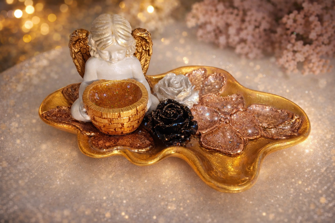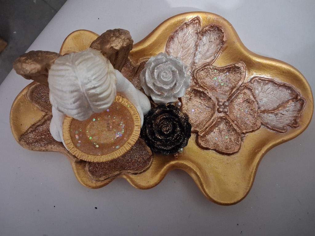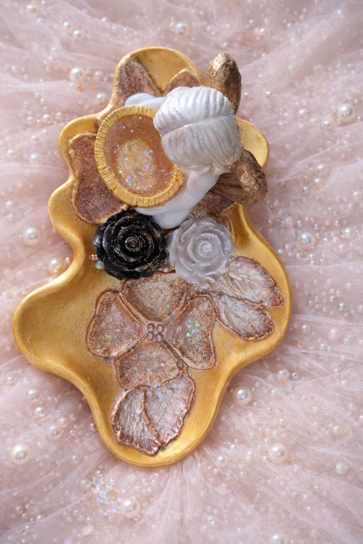 Ręcznie wykonany aniołek dekoracyjny z czarną i białą różą z gipsu, z delikatnymi perłowymi dodatkami. Elegancka i wyjątkowa dekoracja do domu lub oryginalny prezent dla bliskiej osoby. Każdy egzemplarz jest unikatowy i starannie wykończony, co podkreśla jego wyjątkowy charakter.