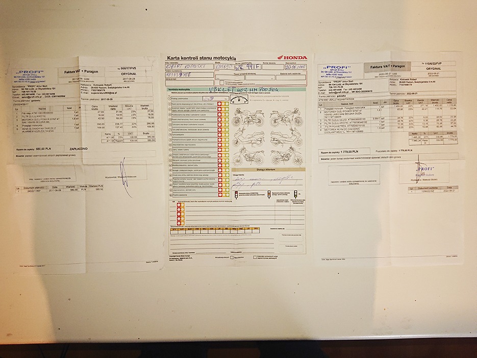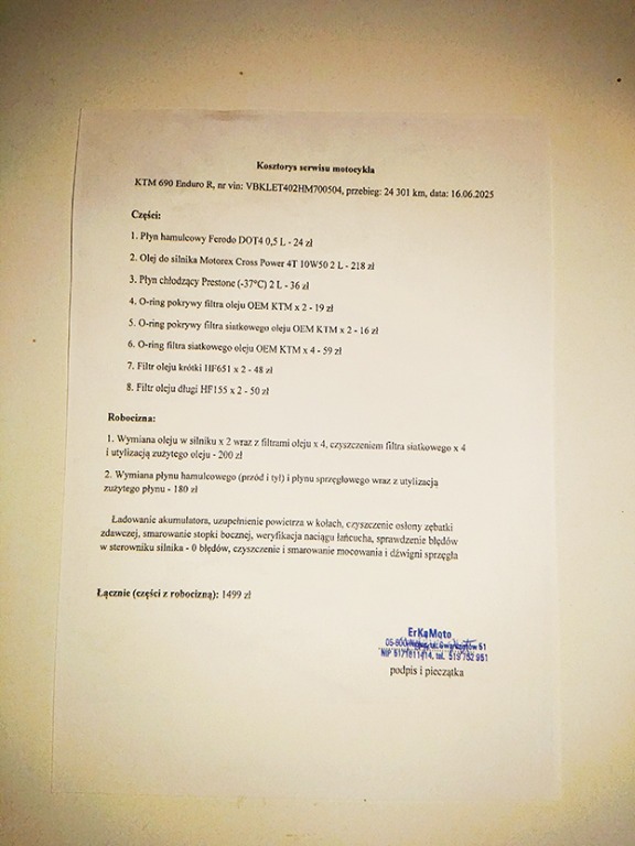W tym roku w czerwcu wymienione wszystkie filtry, olej, płyn hamulcowy i chłodniczy, po tym przeglądzie przejechane ma ok 1 tys. km. W zeszłym roku zmienione: akumulator, zębatki, łańcuch, przy przebiegu 22 tys. km. Regulacja zaworów w 2022 r. przy przebiegu 15 tys. w salonie KTM.