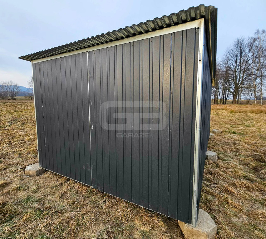 Blaszak 3×5 m II gat – garaż na budowę – konstrukcja wolnostojąca – brama – spad dachu do tyłu GB101
