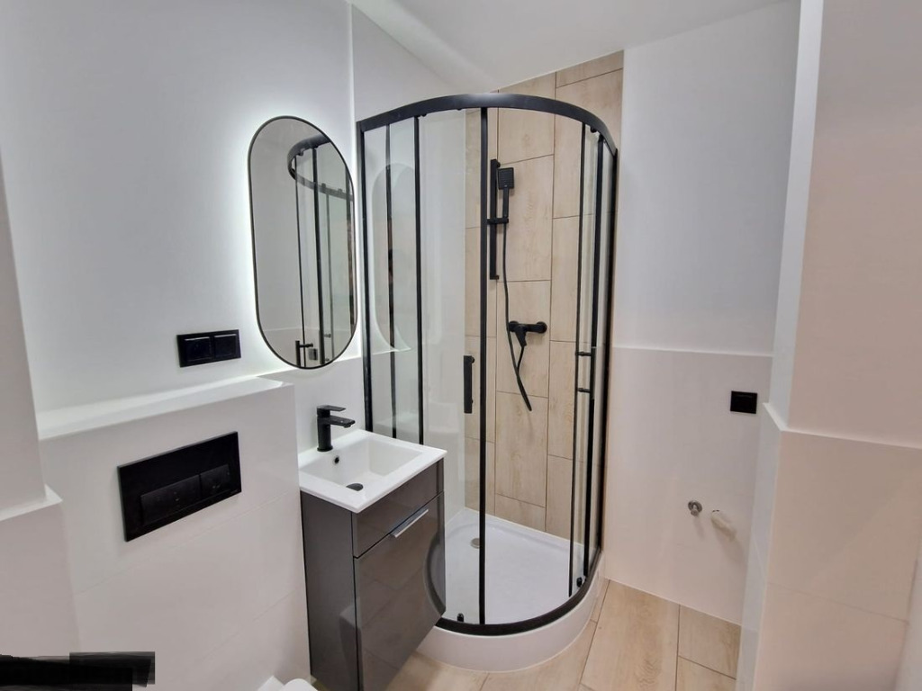 - łazienka z kabiną prysznicową i miejscem na pralkę