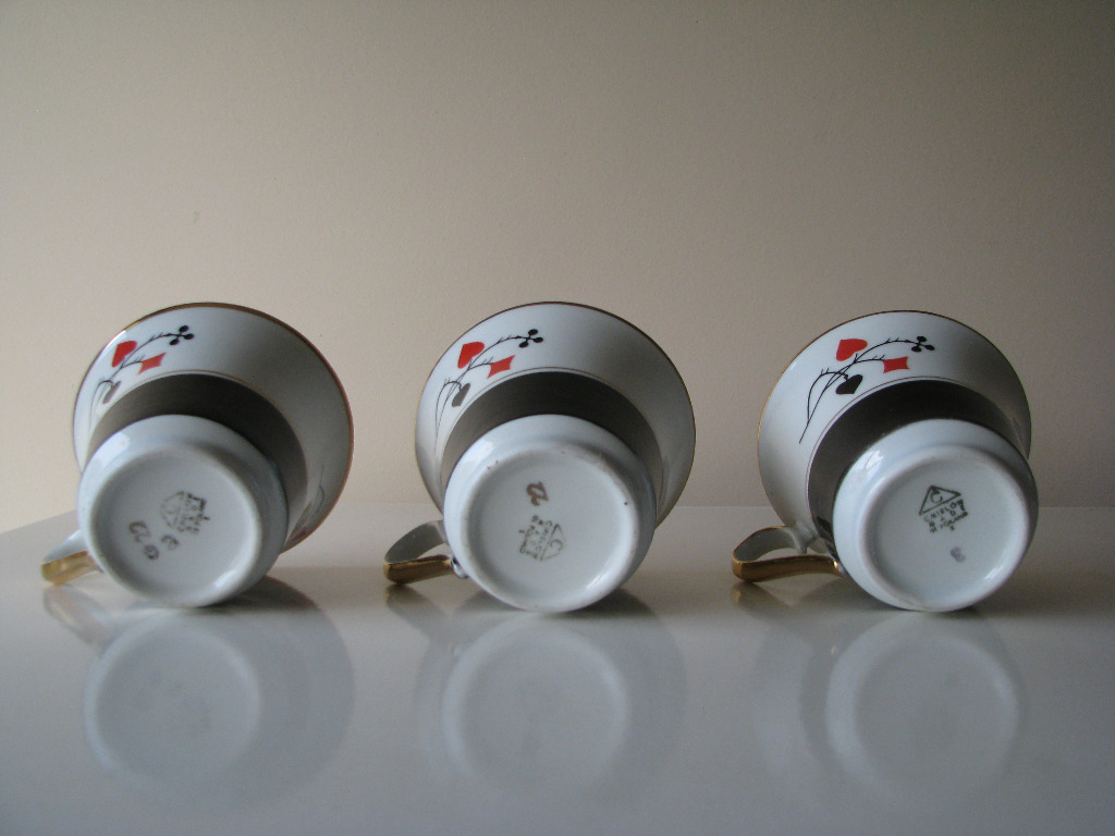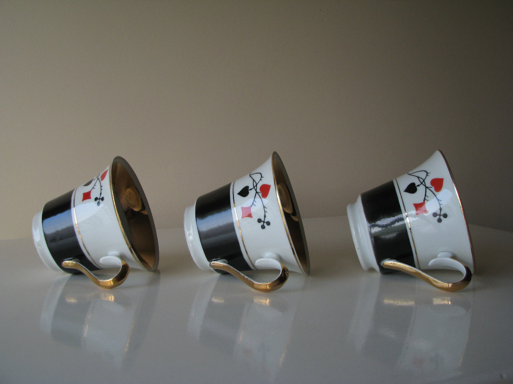 Sprzedam trzy piękne, porcelanowe filiżanki z dekoracją karcianą projektu Wincentego Potackiego, wyprodukowane i sygnowane przez fabrykę porcelany Ćmielów.