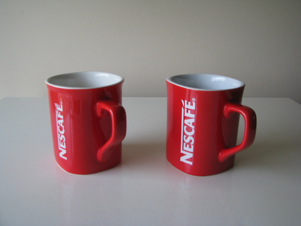 Sprzedam kubki do kawy w kolorze czerwonym w kształcie czworoboku z logiem Nescaffe.