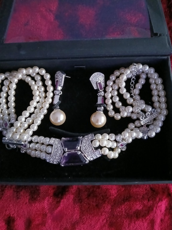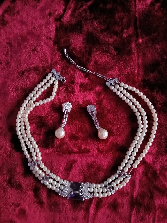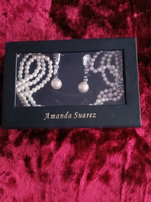 Przepiekna, Kolia z Kolczykami znanej projektatki Amandy Suarez, zakupiony w DUBAJU. Wykonana z Perelek z Fioletowymi Kamieniami. Bardzo elegancka, na specjalna okazje lub uroczystosc rodzinną.