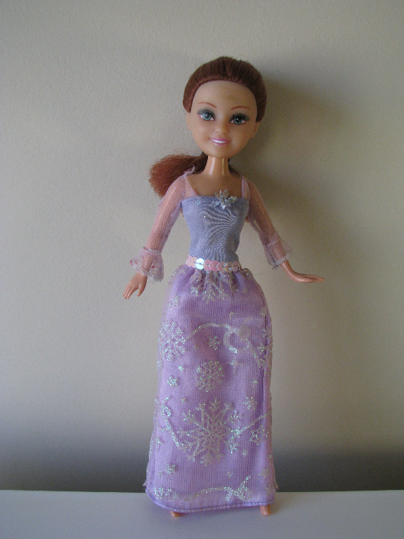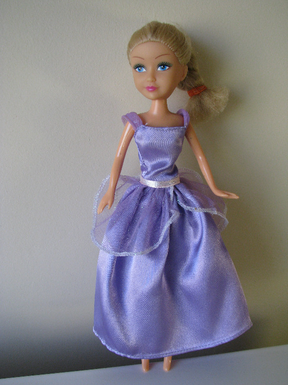 Lalka blondynka ma ciepło-fioletową sukienkę, która na zdjęciach wygląda na niebieską. Kolory ubranka drugiej lalki oddają rzeczywiste barwy.