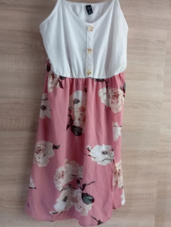 Lekka letnia sukienka na ramiączkach, gora biała dół różowy w duże kwiaty . Stan dobry wygodna i przewiewna Idealna na lato, wakacje czy plażowe spacery. Rozmiar 38