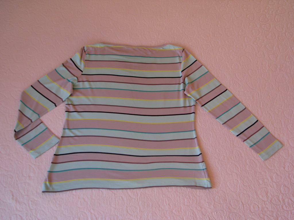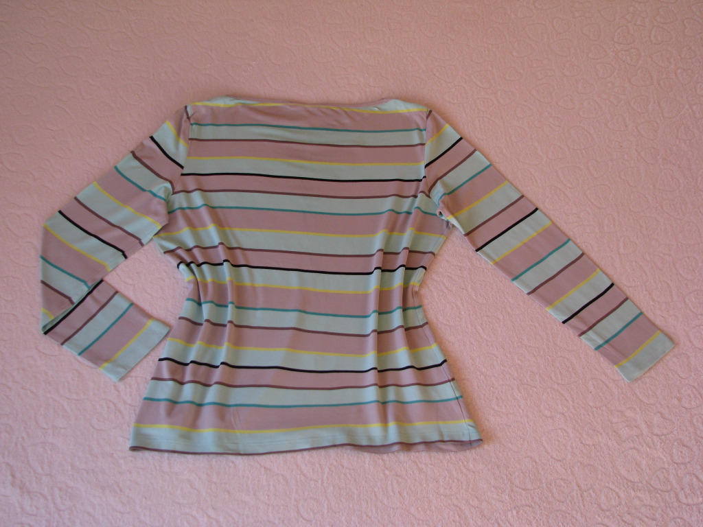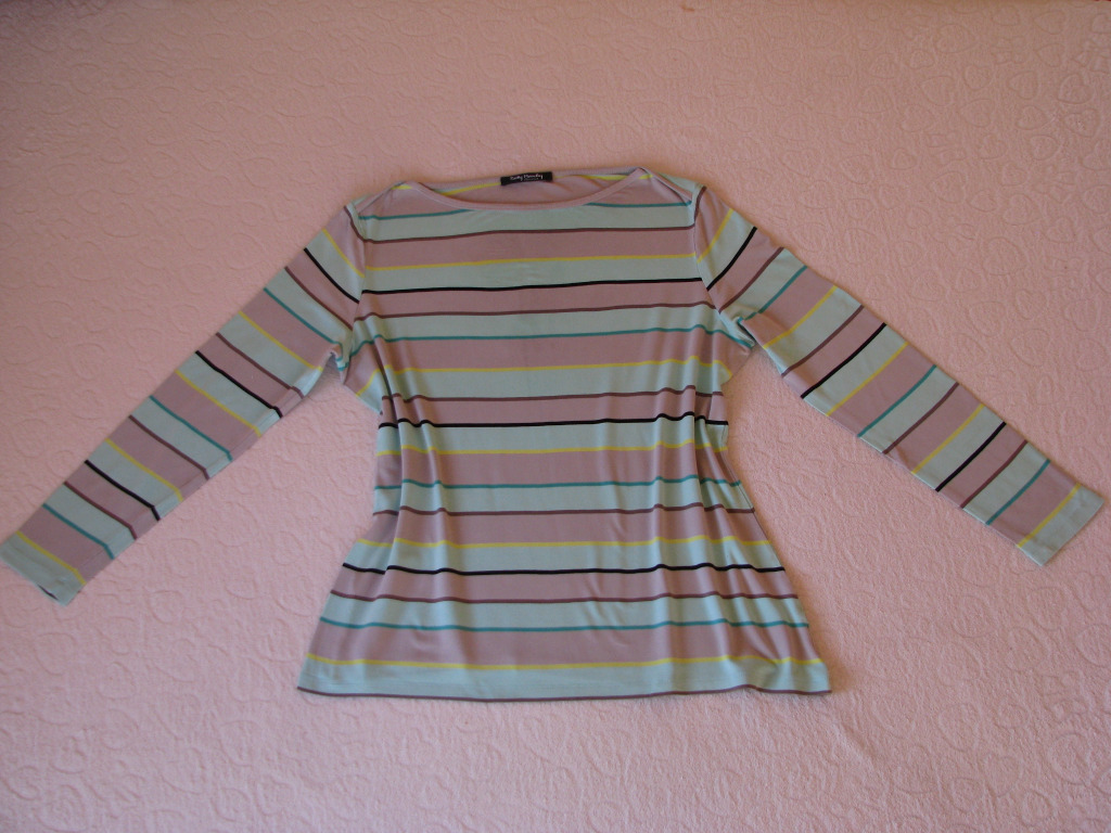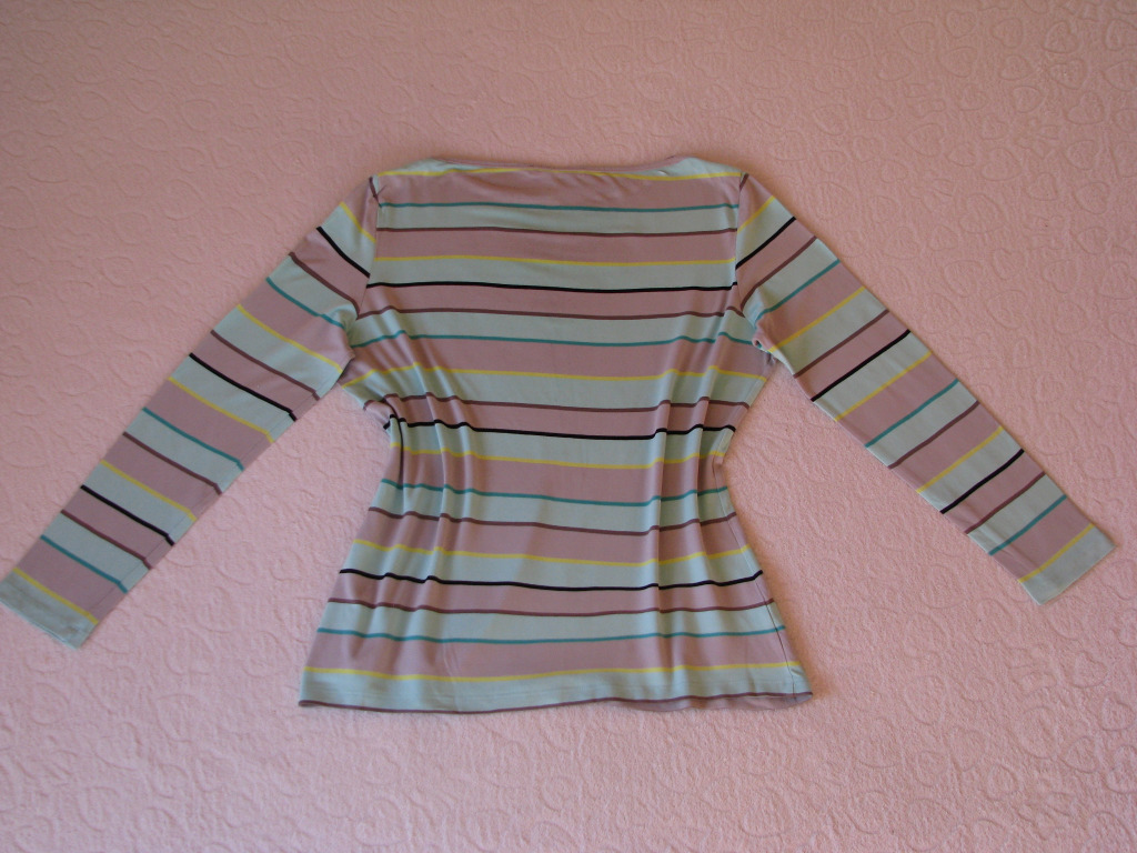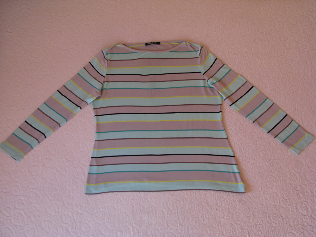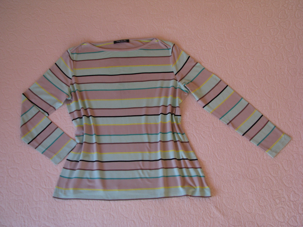 Bluzka w poziome paski w kolorze miętowo-popielatym przełamane cieńszymi paskami w kolorze cytrynowym, brązowym i czarnym. Dekolt w łódkę, wykończony jest popielatym obszyciem.