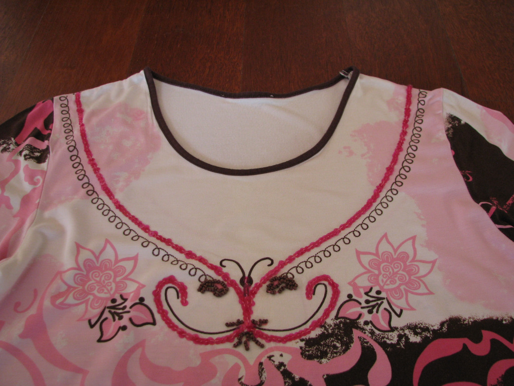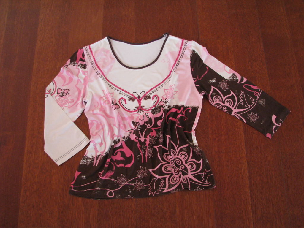Koszulka wykonana z wysokiej jakości, bardzo mięciutkiej i przyjemnej w dotyku wiskozy z elastycznym dodatkiem (elastan), w kolorach biało-różowo-brązowych. Bluzka posiada ładny wzór, z przodu aplikacja podkreślona jest różowymi cekinkami i brązowymi koralikami, okrągły dekolt wykończony jest brązowym obszyciem.