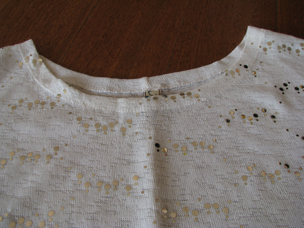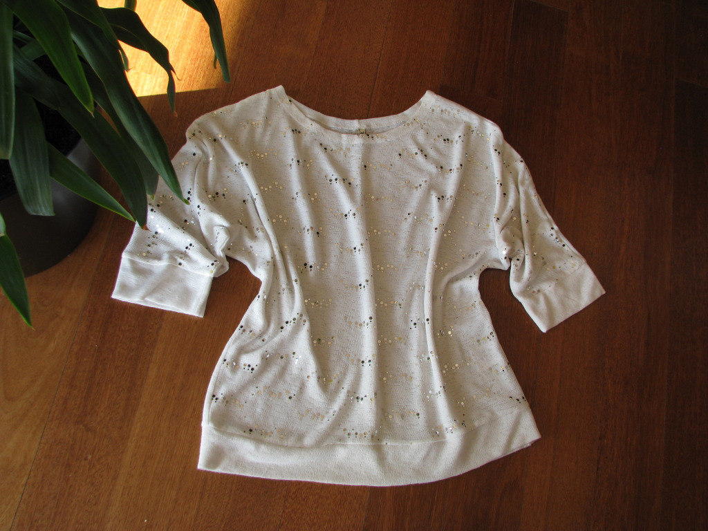 Bluzka wykonana z przyjemnej w dotyku i przewiewnej dzianinki w białym kolorze. Przód bluzki na całej powierzchni ozdobiony jest mieniącymi się na srebrno cekinkami, tył gładki. Sweterek zakładany jest przez głowę, wykończenie pod szyją okrągłe, rękawki po założeniu ¾.